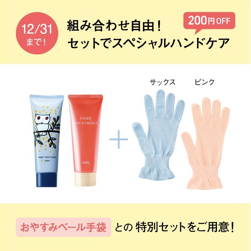 おやすみベール手袋」と「ハンドトリートメント」をセットでご購入ごとに、通常合計価格より税込200円値引きいたします。この機会をお見逃しなく!