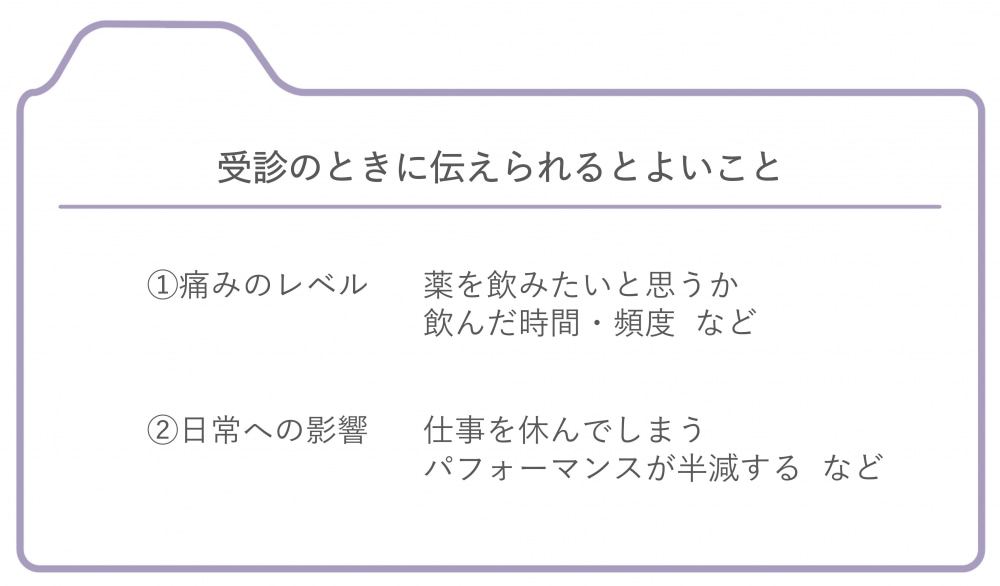 飯田先生ご自身で少しでもつらいと感じたら、ぜひ受診を。生理中でも大丈夫ですよ。そして診察では生活にどのくらい支障が出ているのか、ご自身が感じていることを教えてほしいです。