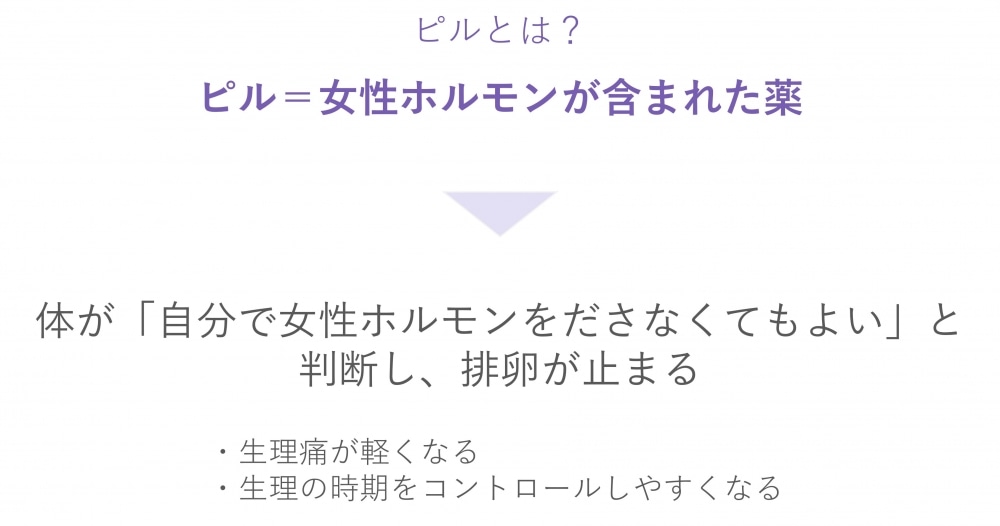 飯田先生ピルは女性ホルモンが含まれたお薬で、服用すると体が「自分で女性ホルモンを出さなくてもよい」と判断し、排卵が止まります。生理や生理痛が軽くなったり、人によっては肌荒れが改善したりといったメリットがあります。