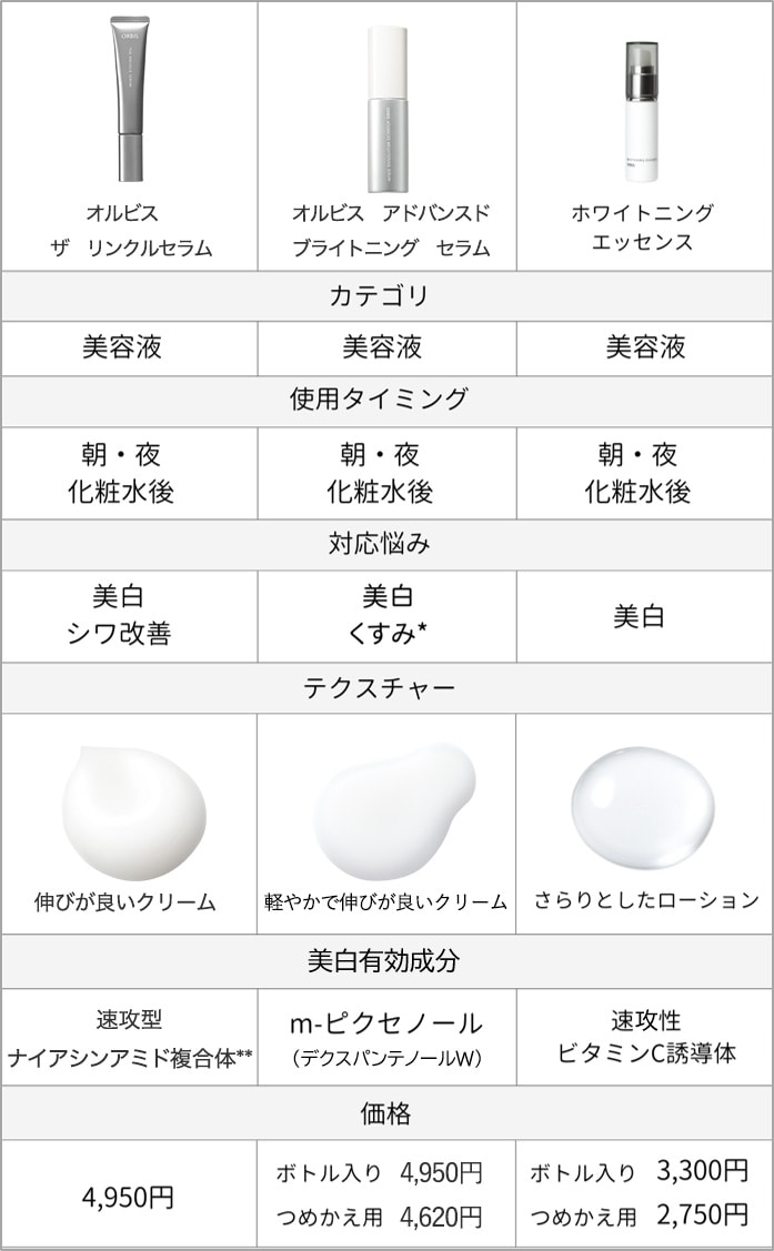 美白*ケアをしたいけれど、どれを選んだらいいかわからない…。そんなあなたのために、オルビスの美白ケアアイテム全品を、比較表でまとめてご紹介!また、アイテムが多くて選べないという方に、実際に社員が愛用中のアイテムを年齢別に調査してみましたので、ぜひ参考にしてみてください。