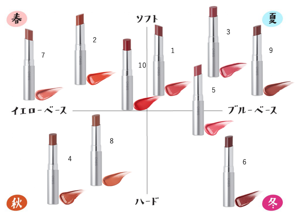 今回はそんなオルビスのリップカラー全22色を、パーソナルカラーの4タイプ(春・夏・秋・冬)で分類しました。分布図の活用方法もご紹介するのでぜひアイテム選びの際の参考にしてみてくださいね!
