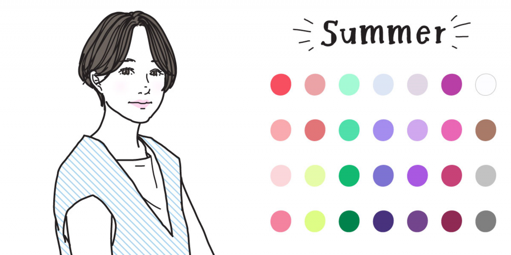 上品でさわやかな印象の夏タイプさん。くすんだ色やグレーがかったスモーキーカラーがお洒落に映えてよく似合います。全体を明るいトーンでまとめたいときはリップにピンク系を、大人っぽく仕上げたいときや唇にポイントを持ってきたいときはローズ系のアイテムを取り入れるのがおすすめです。