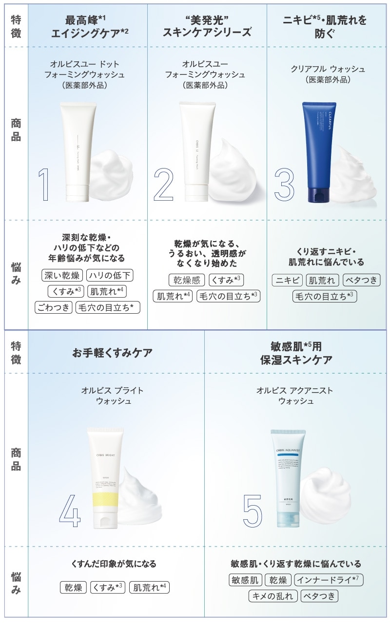 毎日使う洗顔料は、肌のお悩みを軸に、洗いあがりの好みや生活スタイルに合わせて選びましょう。すでにオルビスのスキンケアをご使用いただいている方は、迷ったらまずは同じシリーズの洗顔料をチョイスしてみましょう。