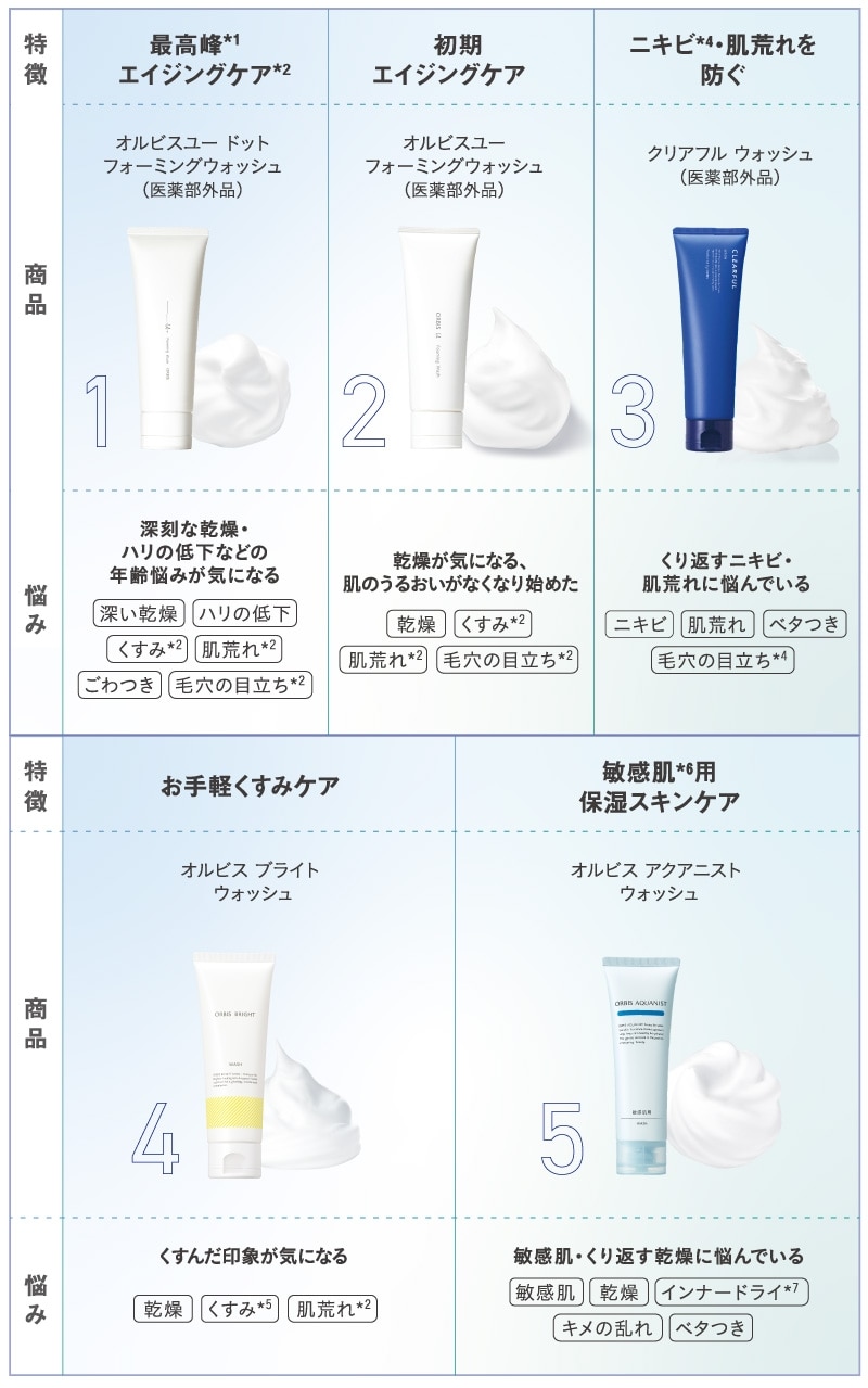 *1 オルビススキンケアシリーズ内保湿力 *2 VOCE 2023年下半期ベストコスメ洗顔部門1位 *3 年齢に応じたお手入れのこと *4 メラニンの生成を抑え、シミ・ソバカスを防ぐ(オルビスユー ドット エッセンスローション(医薬部外品)、オルビスユー ドット クリームモイスチャライザー(医薬部外品)のみ。オルビスユー ドット フォーミングウォッシュは肌荒れを防ぐ) *5 角層まで