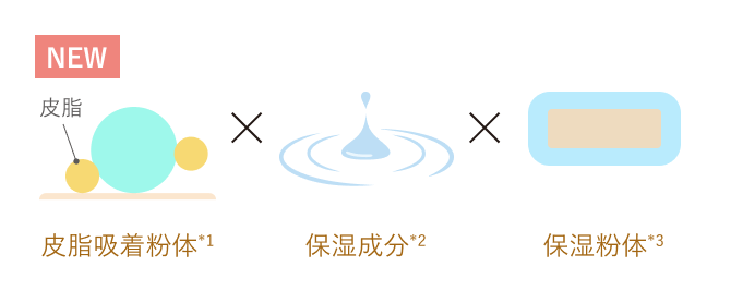 午後の肌は、乾燥によるパサつきと、皮脂によるテカリが同時に現れやすいもの。リニューアルした「プレストパウダー」には、新たに皮脂を吸着する粉体*1を配合。従来の保湿成分*2や保湿粉体*3も配合し、うるおいをチャージしながら、乾燥や皮脂など、くずれの原因になるものから肌を守ります。
