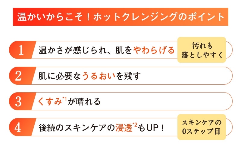 特に、乾燥により肌がくすみ、不調を感じやすい秋冬は、肌をやさしくほぐしながら汚れを落とし、必要なうるおいはきちんと残してくれるクレンジングを使いたいところ。そこでおすすめなのがホットクレンジングです。