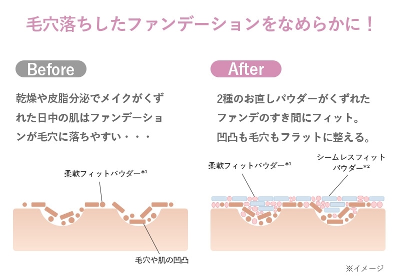 ①柔軟フィットパウダーを新たに配合した、毛穴対策型・ポアレスフラット処方