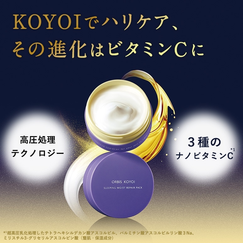 ハリと透明感*¹にアプローチする3種類のビタミンC*²を、高圧テクノロジーにより毛穴2,500 分の1サイズに乳化粒子化。浸透感を高めることで、夜のボーナスタイム中にぐんぐん肌深くまで*³うるおいを補給する設計に!寝ているあいだの集中ケアを叶えます。
