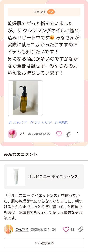 気になっていた商品について投稿しているメンバーがいたら、コメントでさらに深堀り質問することも可能です◎