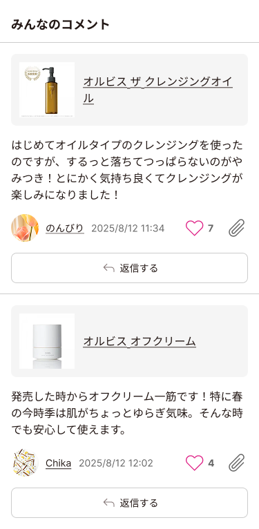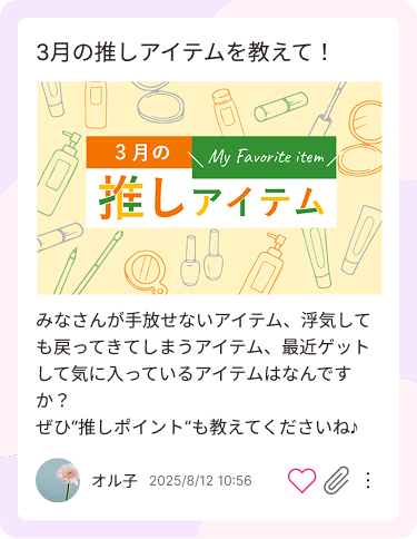 「みんなの推しアイテム」とは、コミュニティメンバーが今いちばん好きな商品とその魅力を存分に語り合えるコーナー。オルビス歴の長いVIPメンバーだからこそ知っているニッチな商品や、最近話題の新商品の“リアルな感想”が集まります♪