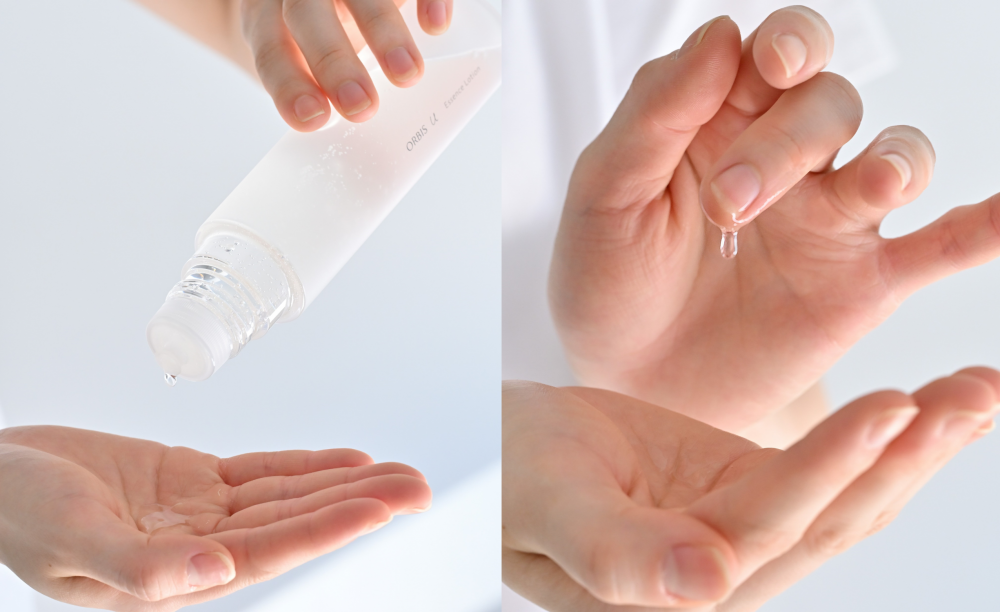 ローションは、手に取った瞬間はとろっと濃密。でも肌に伸ばすと、ぱしゃっと水のように広がり、軽やかな使い心地に変わります。朝はスキンケア後すぐにメイクに移りたい私にもぴったり。