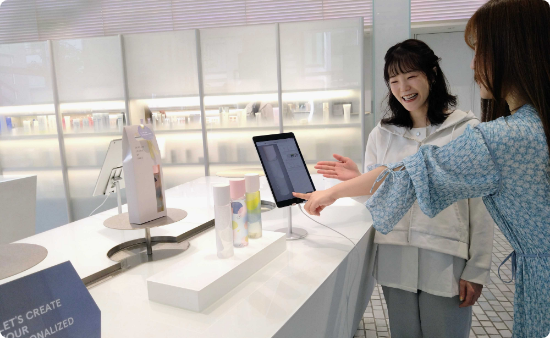 ラウンジ限定で「オルビスユー エッセンスローション」のボトルに、お好きなデザインと名前を印字して、店舗で当日受け取れるサービスもご用意しています。