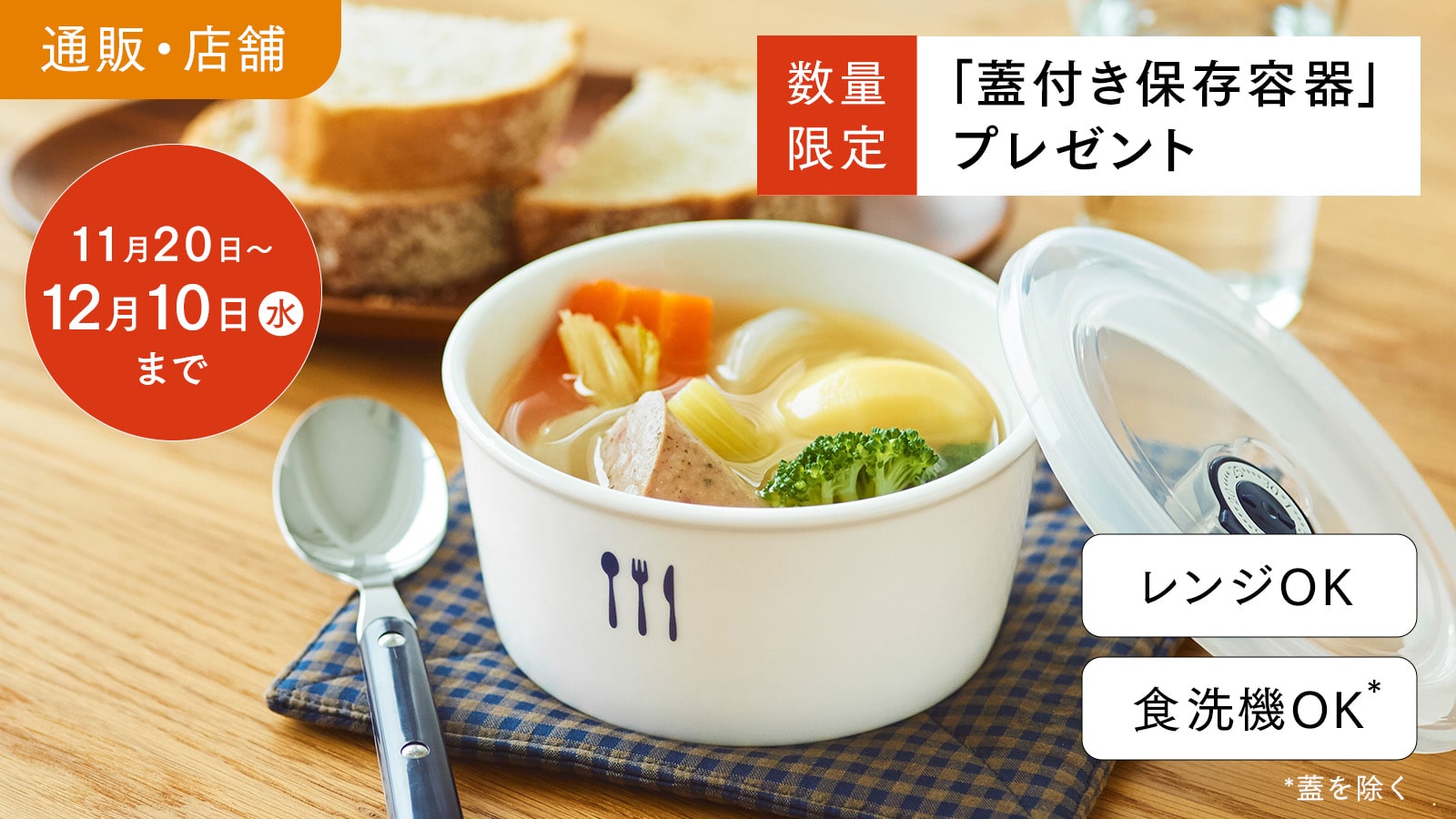 期間中、1回のご注文金額が11,000円(税込)*以上で、「蓋付き保存容器」をプレゼントいたします!器としても使える保存容器なので、冷蔵庫で保存もできて、そのまま電子レンジで加熱*するだけで食卓へ。洗い物も減らせて、時短にもなります。