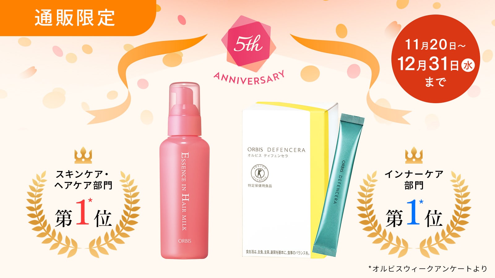 スキンケア・ヘアケア部門第1位*「エッセンスインヘアミルク」、インナーケア部門第1位*「オルビス ディフェンセラ」をセットに。冬にピッタリの人気No.1セット、この機会に是非お試しください。
