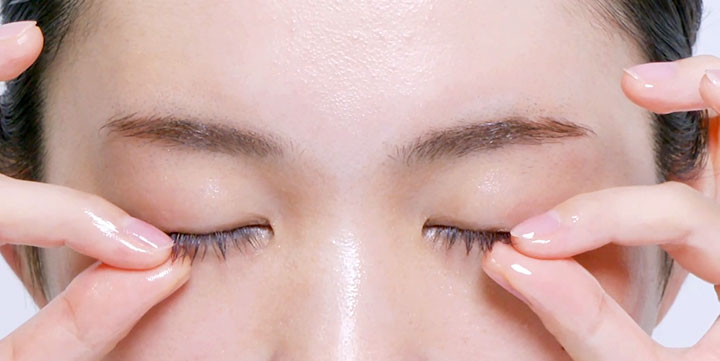 頬を落とす際は内側から外側に向かって優しくなでるように。まぶたも内側から外側の順にやさしくなじませ、マスカラは指と指でまつ毛を挟み、軽くこすり合わせて落とします。