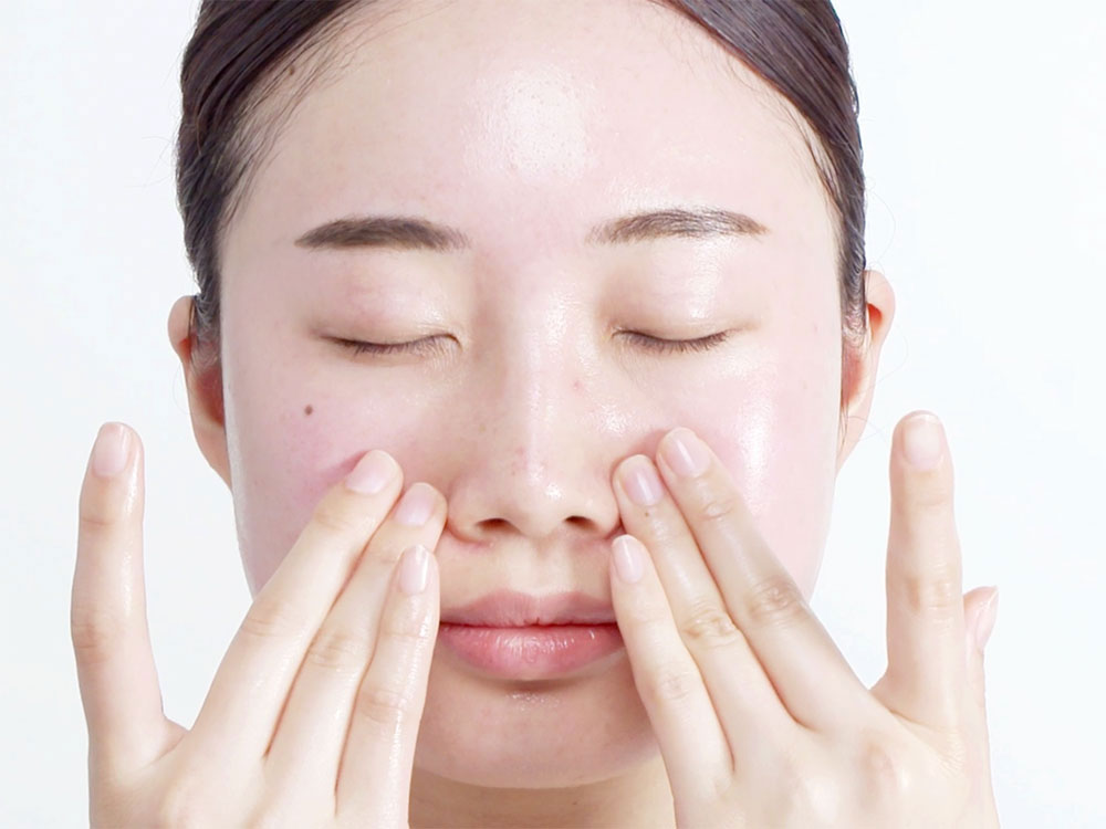 特にニキビができやすい部分には、ハンドプレス(手で押しあてる)で優しくなじませ、決してこすらないのがポイントです。