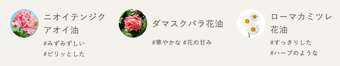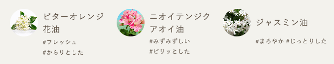「素肌の匂い」は悪いニオイだけでなく、いい匂いもあります。 グローイングセントボディオイルは、素肌の匂いを“いい匂い”にするため、“肌コンディション”に着目。 3つのタイプに不足している水分油分を補いながら、相性のいい香りを賦香させることで“自然ないい匂い”を引き立てます。