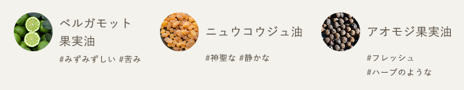 ベルガモットのフレッシュさが肌になじむと、ハーブのアクセントが交わることでさらに引き立ち、剥きたての果実を頬張ったときのような香りに。