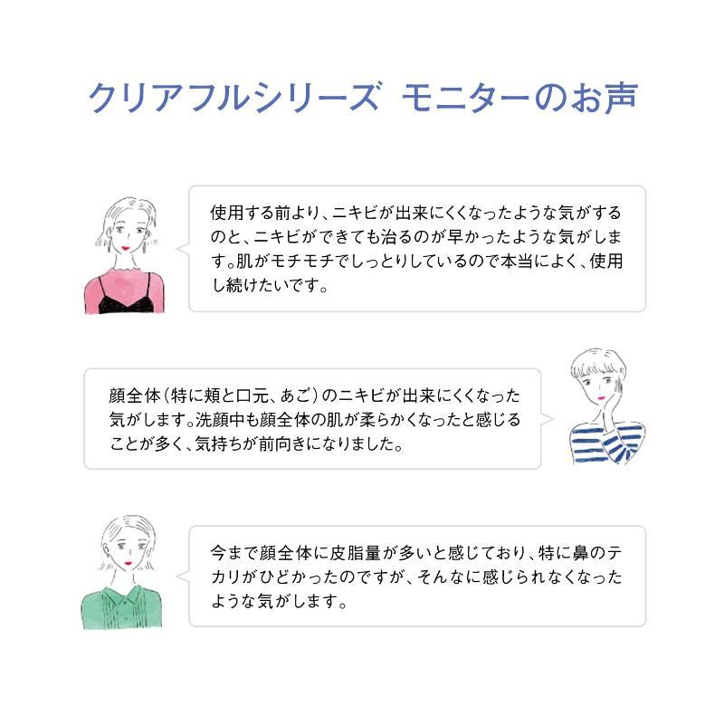【全成分表示】【クリアフル ウォッシュ <洗顔料>】 【有効成分】グリチルリチン酸ジカリウム 【その他の成分】水、濃グリセリン、パルミチン酸、ラウリン酸、水酸化カリウム、ステアリン酸、ミリスチン酸、ヤシ油脂肪酸メチルタウリンナトリウム、マルチトール液、ラウリン酸アミドプロピルベタイン液、塩化ジメチルジアリルアンモニウム・アクリルアミド共重合体液、ソルビトール発酵多糖液、ラウリルヒドロキシスルホベタイン液、シクロヘキサンジカルボン酸ビスエトキシジグリコール、シコニン、テトラ2-ヘキシルデカン酸アスコルビル、天然ビタミンE、ユズセラミド、イノシット、フィチン酸液、スフィンゴ糖脂質、ヨクイニンエキス、アロエエキス(2)、ヨモギエキス、水溶性コラーゲン液、イソステアリン酸、1,2-ペンタンジオール、1,3-ブチレングリコール、グリセリル-N-(2-メタクリロイルオキシエチル)カルバメート・メタクリル酸ステアリル共重合体、N-ヤシ油脂肪酸アシル-L-グルタミン酸トリエタノールアミン液、炭酸水素ナトリウム、ジエチレントリアミン五酢酸五ナトリウム液 【クリアフル ローションL <化粧水>】 【有効成分】グリチルリチン酸ジカリウム 【その他の成分】水、1,3-ブチレングリコール、ジエチレングリコールモノエチルエーテル、シコニン、テトラ2-ヘキシルデカン酸アスコルビル、天然ビタミンE、ユズセラミド、イノシット、フィチン酸液、スフィンゴ糖脂質、ヨクイニンエキス、アロエエキス(2)、ヨモギエキス、水溶性コラーゲン液、レモングラス抽出液、ヒメフウロエキス、(エイコサン二酸/テトラデカン二酸)デカグリセリル液、シクロヘキサンジカルボン酸ビスエトキシジグリコール、アマチャヅルエキス、イソステアリン酸、1,2-ペンタンジオール、濃グリセリン、クエン酸、クエン酸ナトリウム、フェノキシエタノール、パラオキシ安息香酸メチル 【クリアフル モイスチャーL <保湿液>】 【有効成分】グリチルリチン酸ジカリウム 【その他の成分】水、1,3-ブチレングリコール、濃グリセリン、ジエチレングリコールモノエチルエーテル、シコニン、テトラ2-ヘキシルデカン酸アスコルビル、天然ビタミンE、ユズセラミド、イノシット、フィチン酸液、スフィンゴ糖脂質、ヨクイニンエキス、アロエエキス(2)、ヨモギエキス、水溶性コラーゲン液、アーティチョークエキス、エイジツエキス、クリサンテルムインディクム抽出液、グリセリル-N-(2-メタクリロイルオキシエチル)カルバメート・メタクリル酸ステアリル共重合体、ポリグルタミン酸塩、シロキクラゲ多糖体、ポリオキシプロピレンメチルグルコシド、イソステアリン酸、1,2-ペンタンジオール、ジグリセリン、カルボキシビニルポリマー、水酸化カリウム、クエン酸、クエン酸ナトリウム、ジエチレントリアミン五酢酸五ナトリウム液、フェノキシエタノール、パラオキシ安息香酸メチル