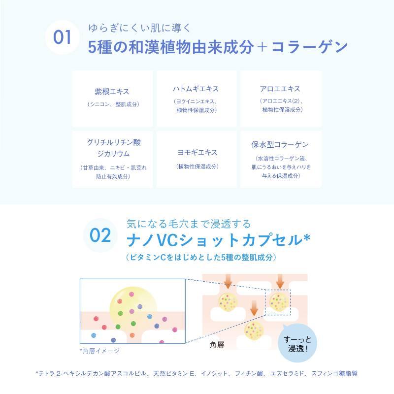 ●アルコールフリー ●グリチルリチン酸ジカリウム(甘草由来)=ニキビ・肌荒れ防止有効成分 ●紫根エキス*1=肌コンディションを整える整肌成分 ●保水型コラーゲン*2=肌にうるおいとハリを与える保湿成分 ●ハトムギエキス*3=植物性保湿成分 ●ヨモギエキス=植物性保湿成分 ●アロエエキス*4=植物性保湿成分 ●ナノVCショットカプセル*5=肌をなめらかに整える整肌成分 ●角栓オフ処方*6=角栓を溶かして除去する処方 ●マイルドアミノ酸系洗浄成分*7=弱酸性の肌を守る洗浄成分