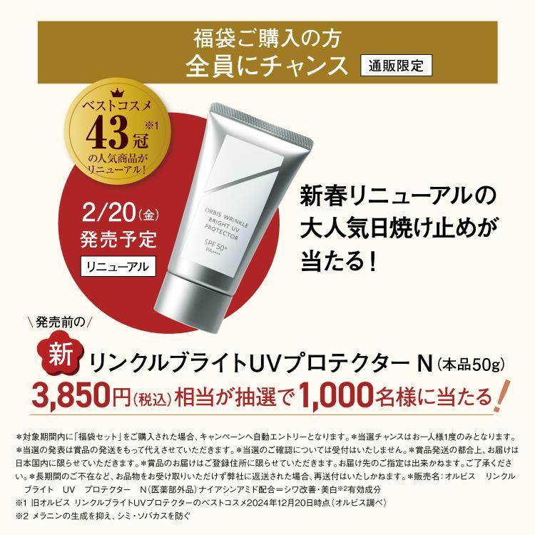 ベストコスメ43冠*4 2/20(金)発売予定 リニューアル 3,850円相当 新リンクルブライト UVプロテクターN(本品50g) 抽選で1,000名様に当たる! 発売前にいち早くゲットできる機会をお見逃しなく! 発売前のリンクルブライト UVプロテクターN(本品50g) 抽選で1,000名様に当たる!