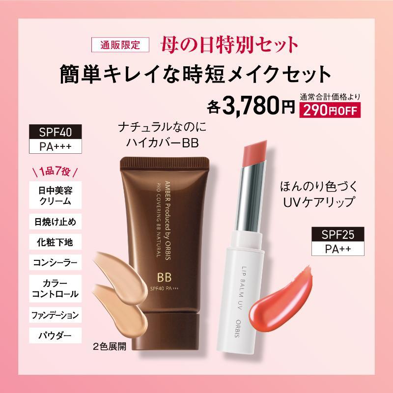 「オルビスアンバー プロカバーリングBB+リップバームUVセット」は、ハイカバーながらナチュラルな仕上がりを叶える大人肌のためのBBクリームと、紫外線ダメージを防ぎながら唇を美しく見せるリップクリームの組み合わせ。時短でキレイが叶うから、ぜひ忙しいお母さんに。