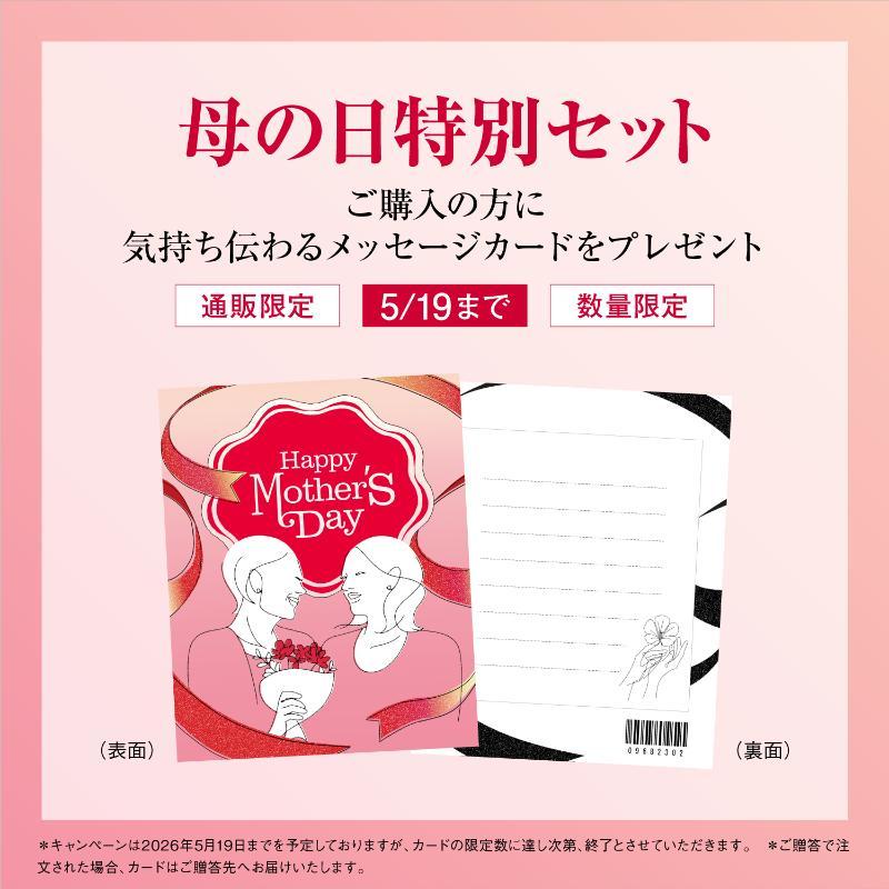 お母さんに日頃の感謝の気持ちを伝えるも良し、一緒に使うも良し。この機会にキレイをプレゼントしてみませんか? ご購入いただいた方には、ご注文商品と一緒にメッセージカードをお届けいたします。