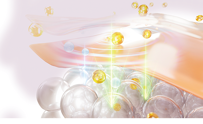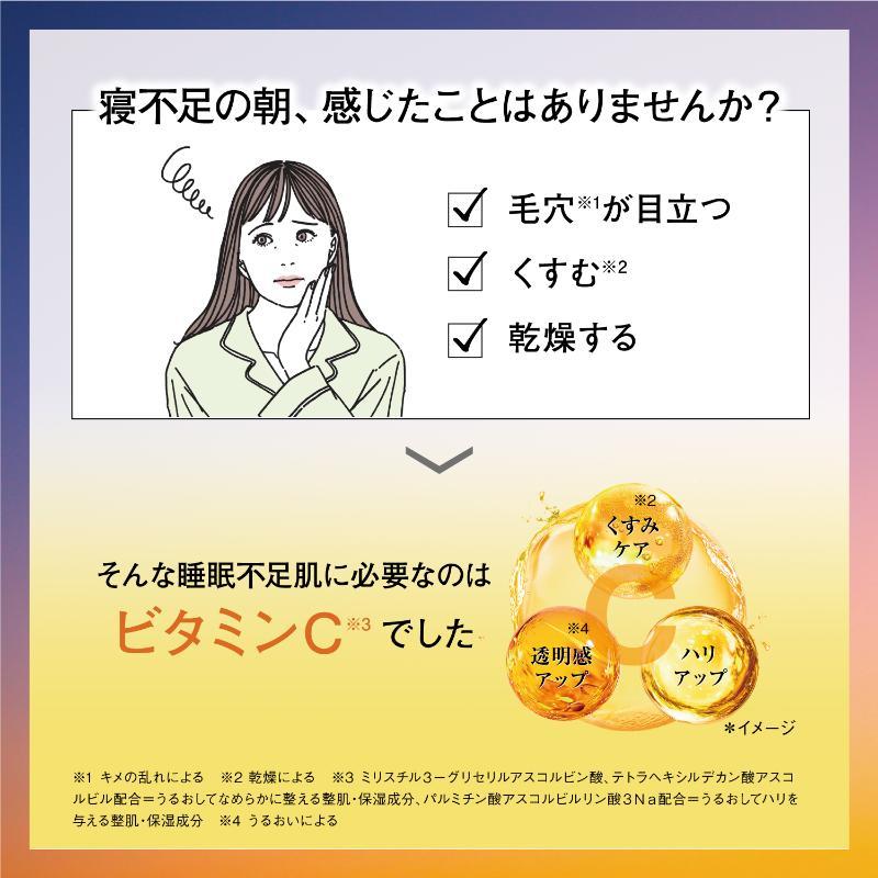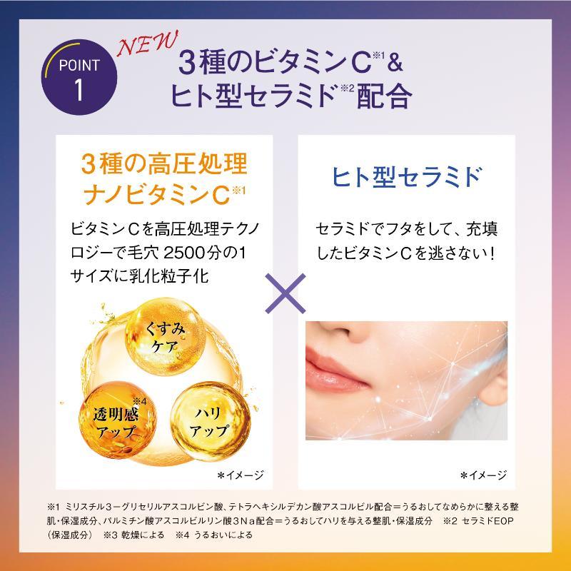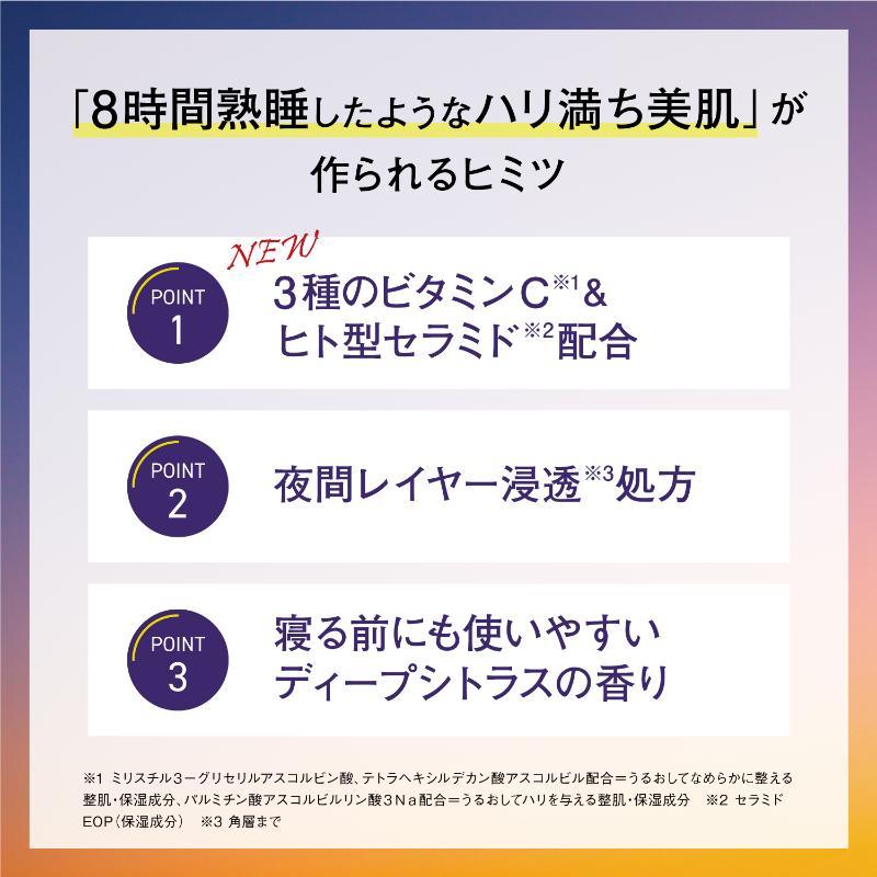 夜間浸透*1サポート成分*2が3種のナノビタミンC*3の浸透をサポート!ヒト型セラミド*4が、表面にフタをすることで寝ている間に時間をかけて徐々に浸透し、美容成分*5が一晩中駆け巡る*1。