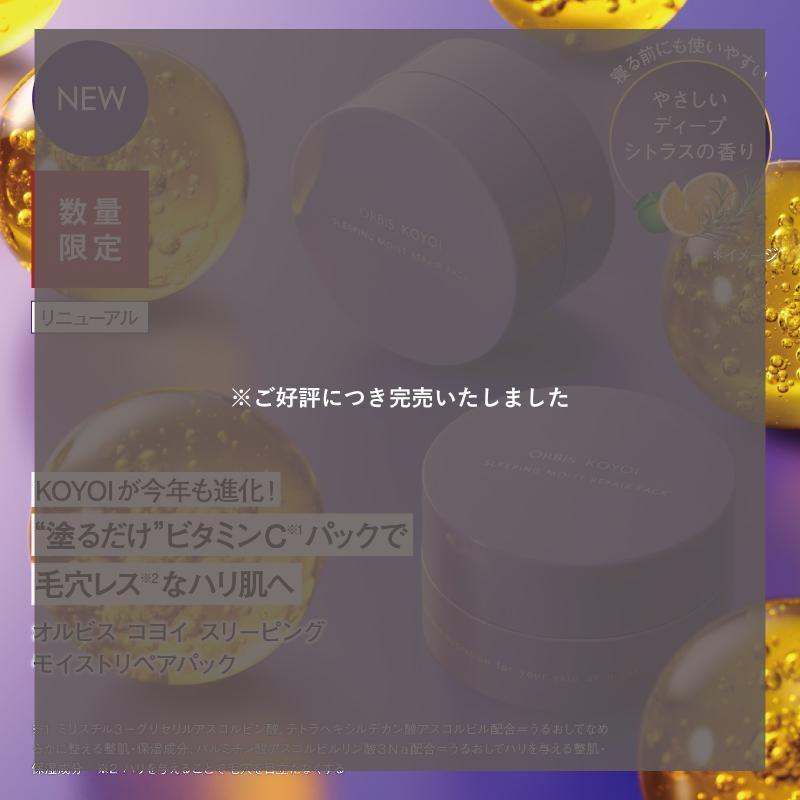 - ※オルビス コヨイ スリーピングモイストリペアパック 2個セットは2026年2月28日までの販売を予定しておりますが、オルビス コヨイ スリーピングモイストリペアパックは数量限定のため終了日が前後する場合がございます。