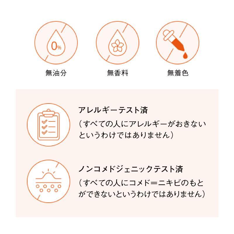 ●無油分、無香料、無着色 ●アルコールフリー ●発酵エキス*1=保湿成分 ●ヒアルロン酸*2=保湿成分