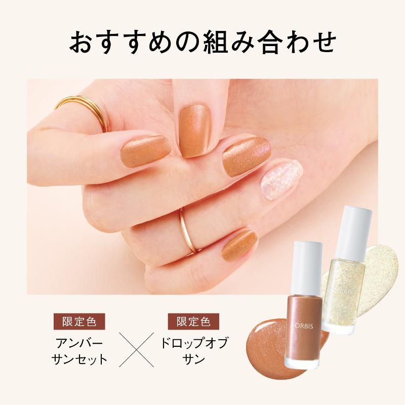 ※「アンバーサンセット」「トワイライトモーヴ」「ドロップオブサン(トップコート)」「ライチソルベ」「ミンティーミルク」「アンティークブロンズ」は数量限定です。在庫がなくなり次第、販売終了とさせていただきます。売り切れの際はご了承ください。
