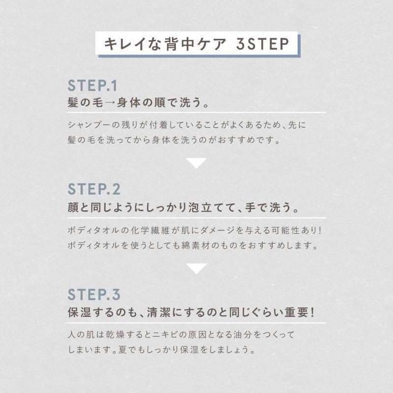 顔と背中では、「皮膚の厚み」が大きく異なっています。背中の皮膚は厚みがあるため、ターンオーバーの周期が遅く、毛穴が詰まりやすいのです。そこで、ボディの角質を和らげる、ボディ用のふわふわ泡を採用しました。たっぷりの泡で皮脂や汗を包み込んでやさしく洗い上げながら、たまった角質までケアします。