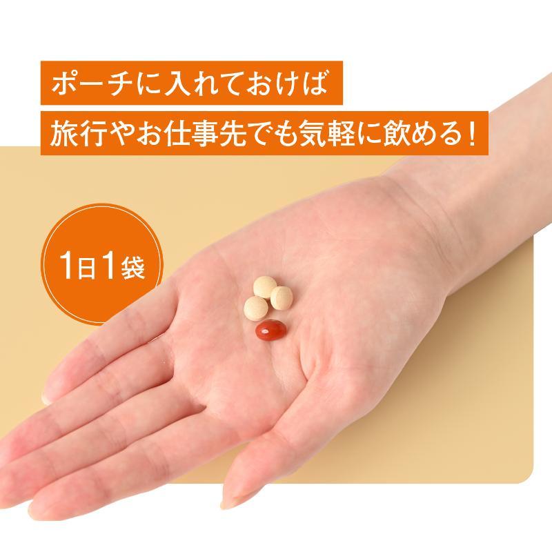 - ●栄養補給の食品として、1日1袋(4粒)を目安に水またはぬるま湯などでかまずにお召し上がりください。