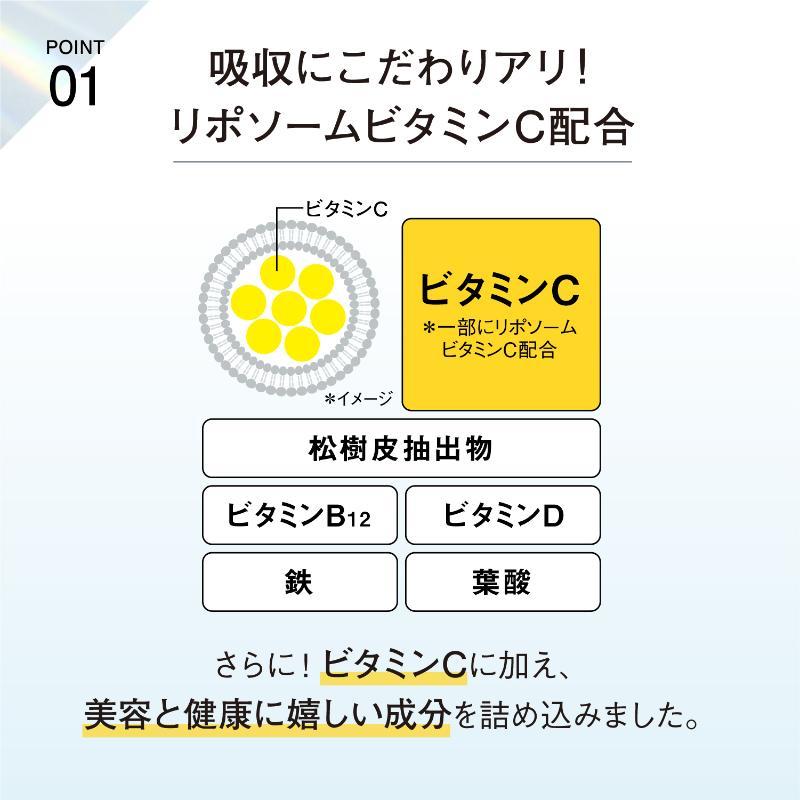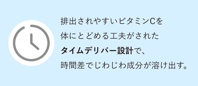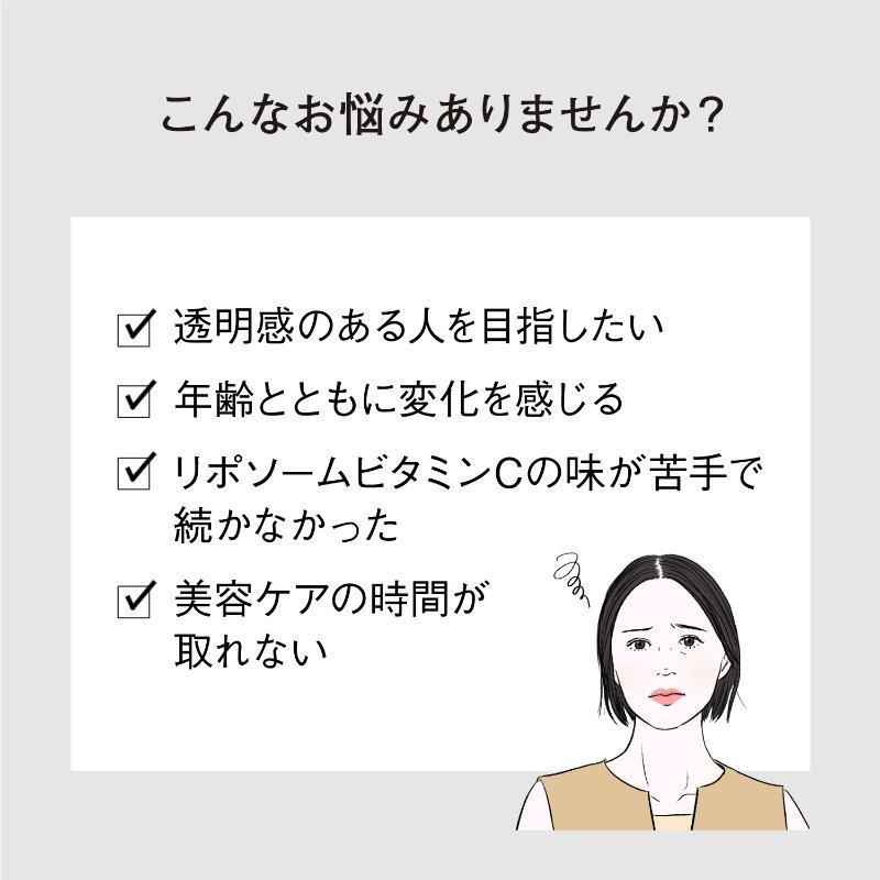 吸収力の高いリポソームカプセルに、レモン約50個分のビタミンCを閉じ込めました。ビタミンCが必要なところにしっかり届く設計です。