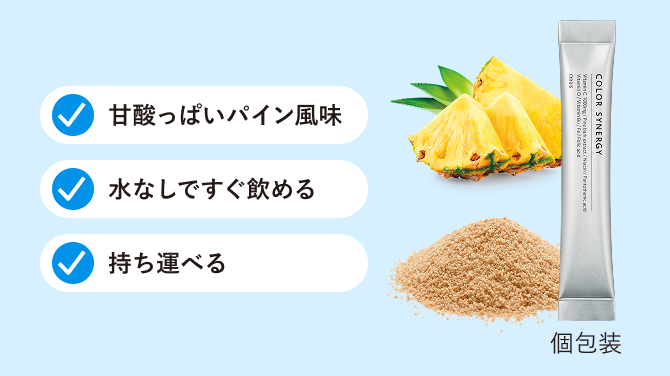 続けていただくために、飲みやすさを追求。リポソーム独特の風味を払拭し、甘酸っぱいパイン風味に仕上げました。