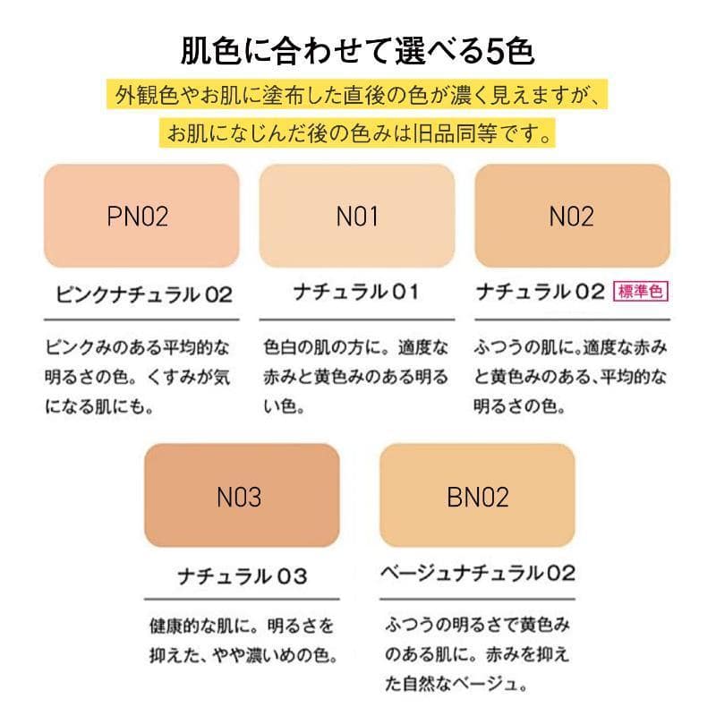 ※外観色やお肌に塗布した直後の色が濃く見えますが、お肌になじんだ後の色みは旧品同等です。
