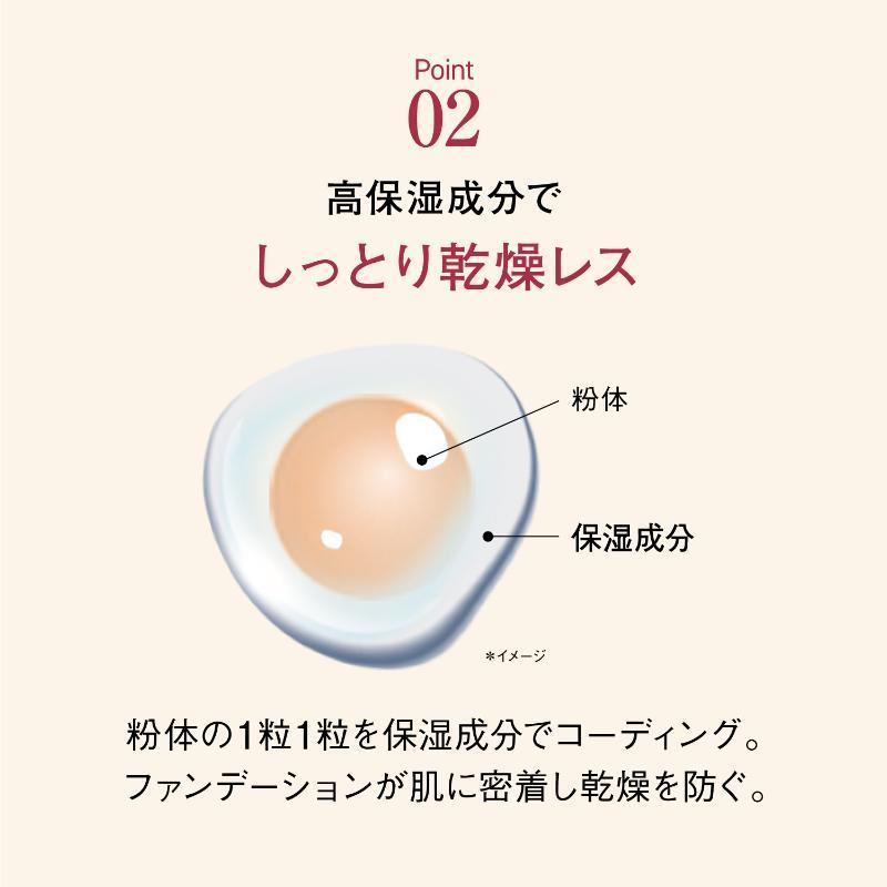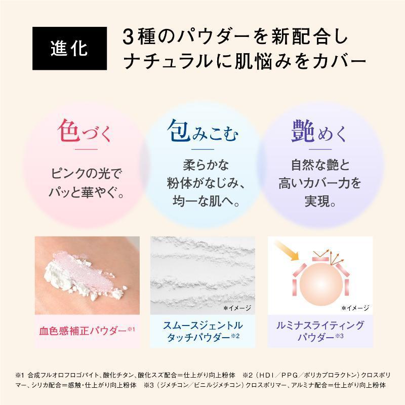 なめらかで均一な仕上がりにパワーアップしました。毛穴もシミもくすみも“光で飛ばす”、3種のパウダーを新配合しています。